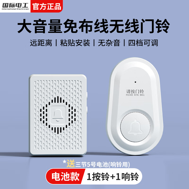 国际电工家用无线门铃远距离叮咚铃老人呼叫器电子遥控大音量入户门铃 白色电池款门铃【1按铃+1响铃】