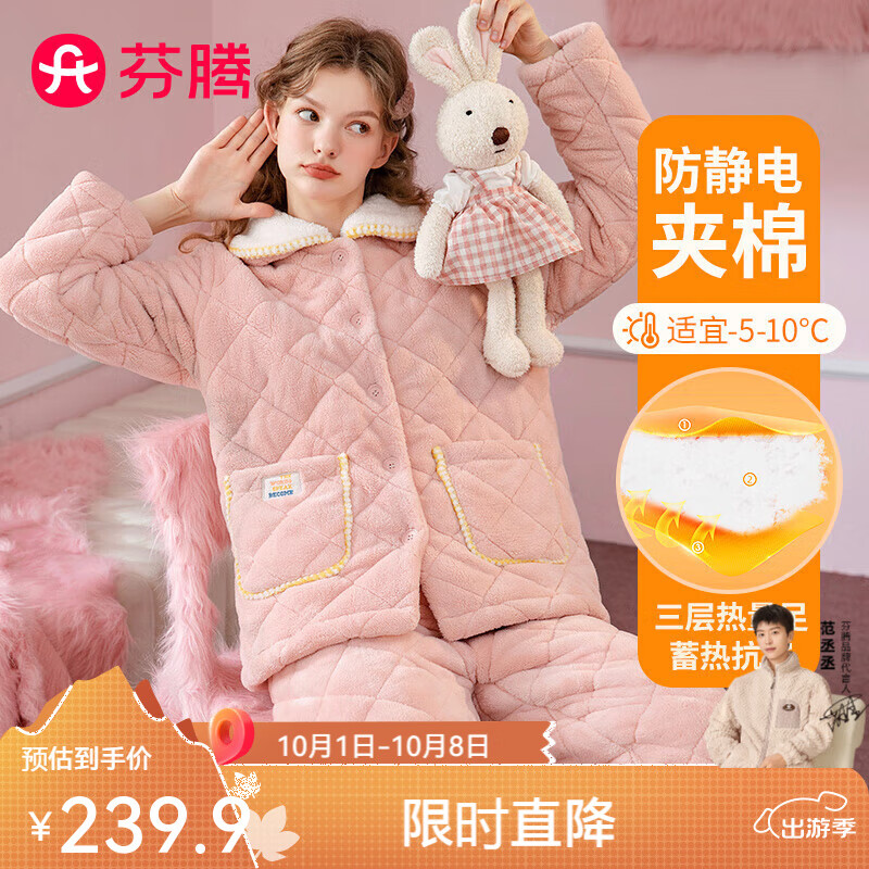 芬腾睡衣女秋冬舒克绒夹棉撞色翻领防静电甜系少女长袖家居服套装 樱花粉 XL