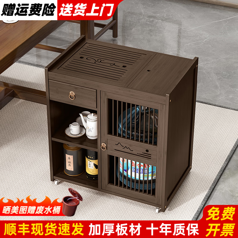 心怡君【顺丰送货上门】移动茶桌茶水柜带轮茶车功夫茶几烧水一体边柜 胡桃色长63cm 单门+抽屉【顶部带盖板】