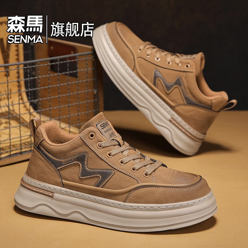 森馬男鞋2026新款夏季高级感百搭休闲板鞋男士厚底防滑小麦色运动潮鞋 土黄【基础款】 39 标准码数/现货秒发