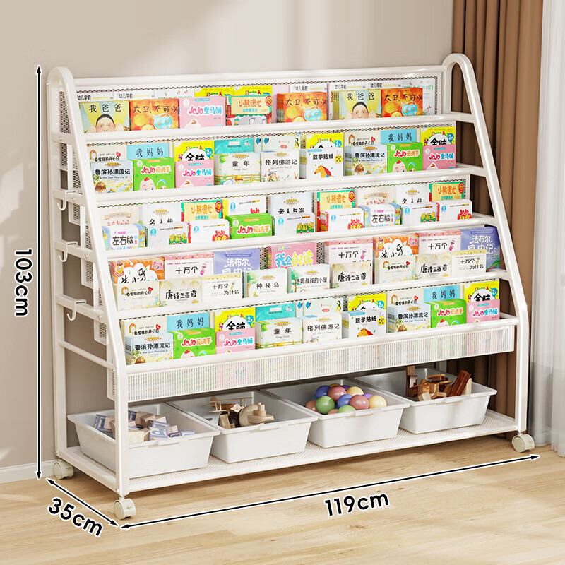 木格格移动书架立式落地书架置物架落地书柜一体靠墙收纳架储物架货架子 119CM-5层密网书架+1层收纳架+4白盒+带轮子+赠送挂钩-