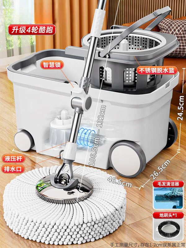 AILUKI日本旋转拖把家用双驱甩干地拖自动脱水式新款布桶一拖墩布拖净 升级四轮酷跑【毛发自动清洁器】高雅白+地刷头+拖把 2个 金属篮 加强杆+塑料盘
