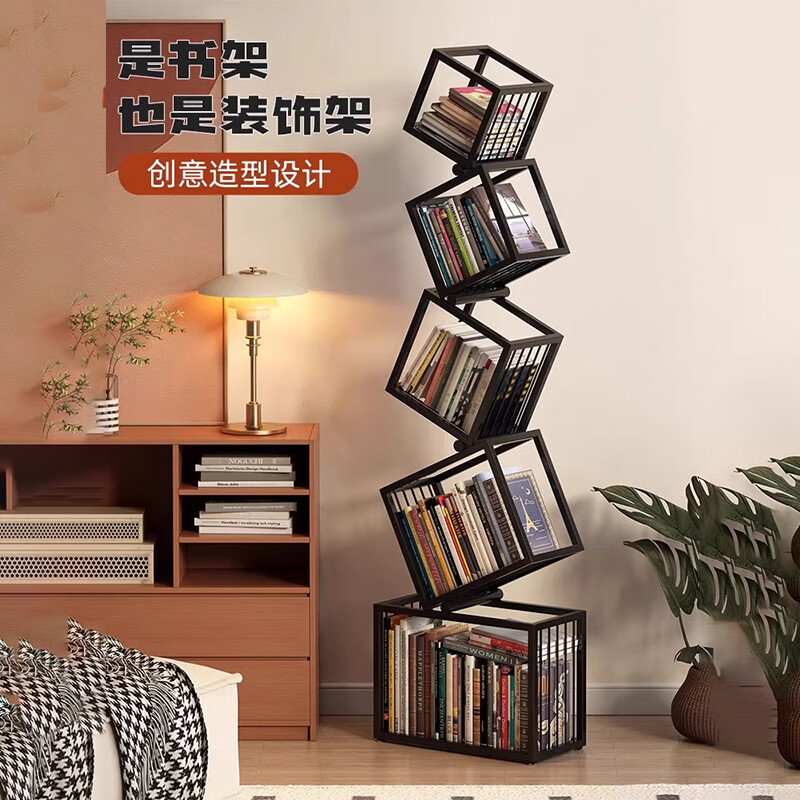 木格格创意转角书架落地置物架铁艺网红异形展示架客厅书柜书架一体靠墙 两层方格-黑色(55*25*90cm)