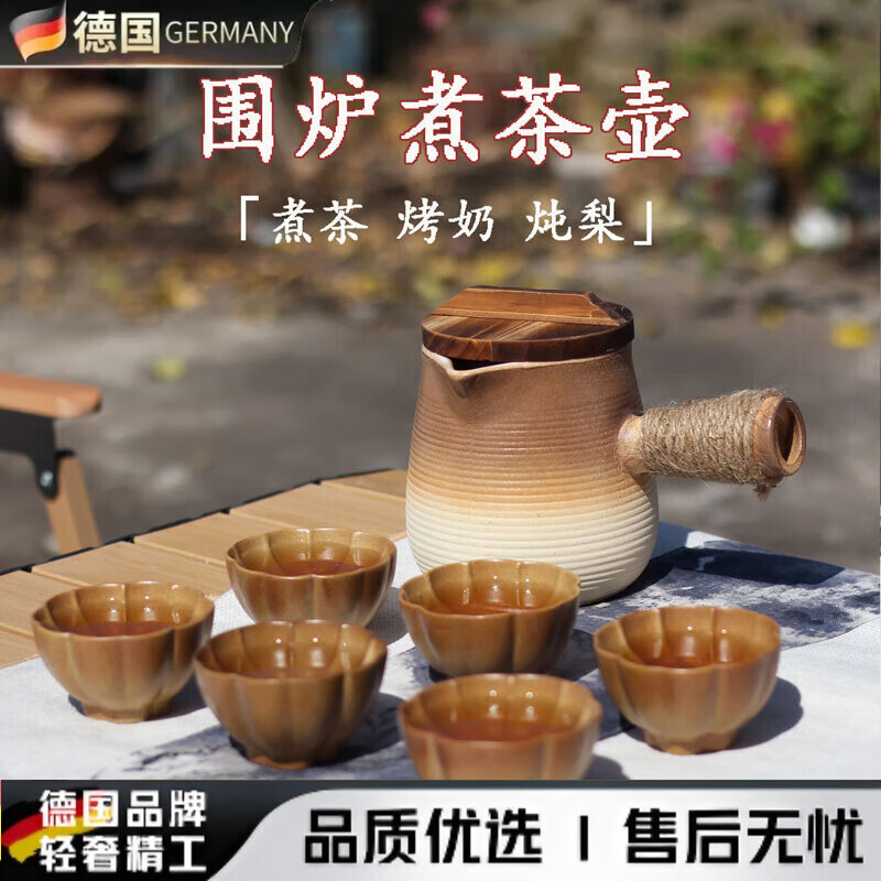 DEATKN德国围炉煮茶壶烤奶罐罐壶全套便携式茶具套装高温炭烧侧把壶茶壶 月牙850ml+木盖+6个花瓣杯