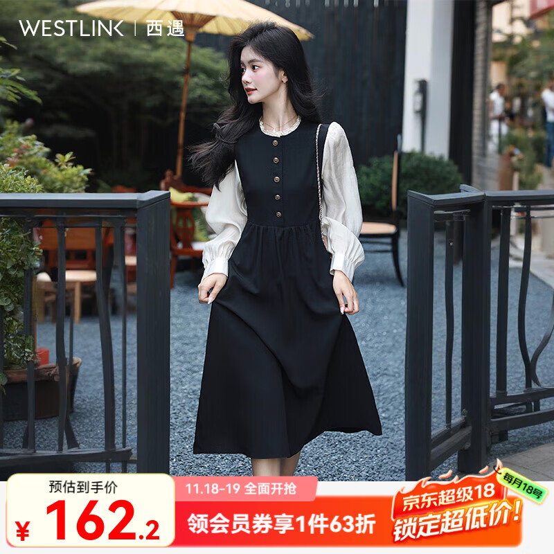 西遇法式黑色长袖连衣裙女2025年秋季新款小香风a字收腰中长裙 黑色 M (160)