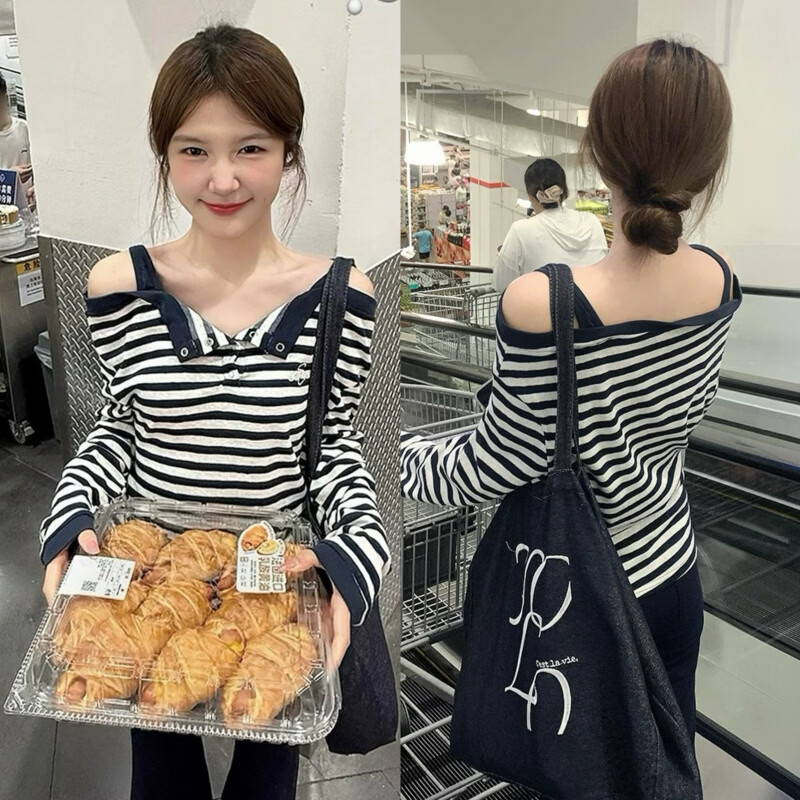 MODX韩系条纹一字肩露锁骨长袖恤女秋季辣妹宽松显瘦露肩假两件上衣 藏青色条纹假两件 S 建议80-90斤