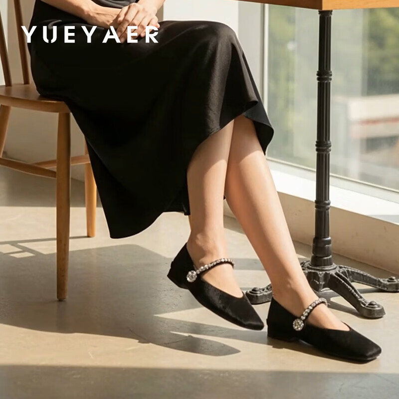 月芽儿玛丽珍鞋女冬季季新款法式气质水钻一字带软底浅口单鞋子 黑色01S 34