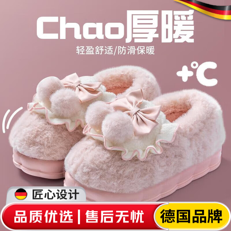 DEATKN德国秋冬毛绒棉拖鞋女款2025防滑款厚底加绒包跟保暖室内家居外穿 粉色 36-37