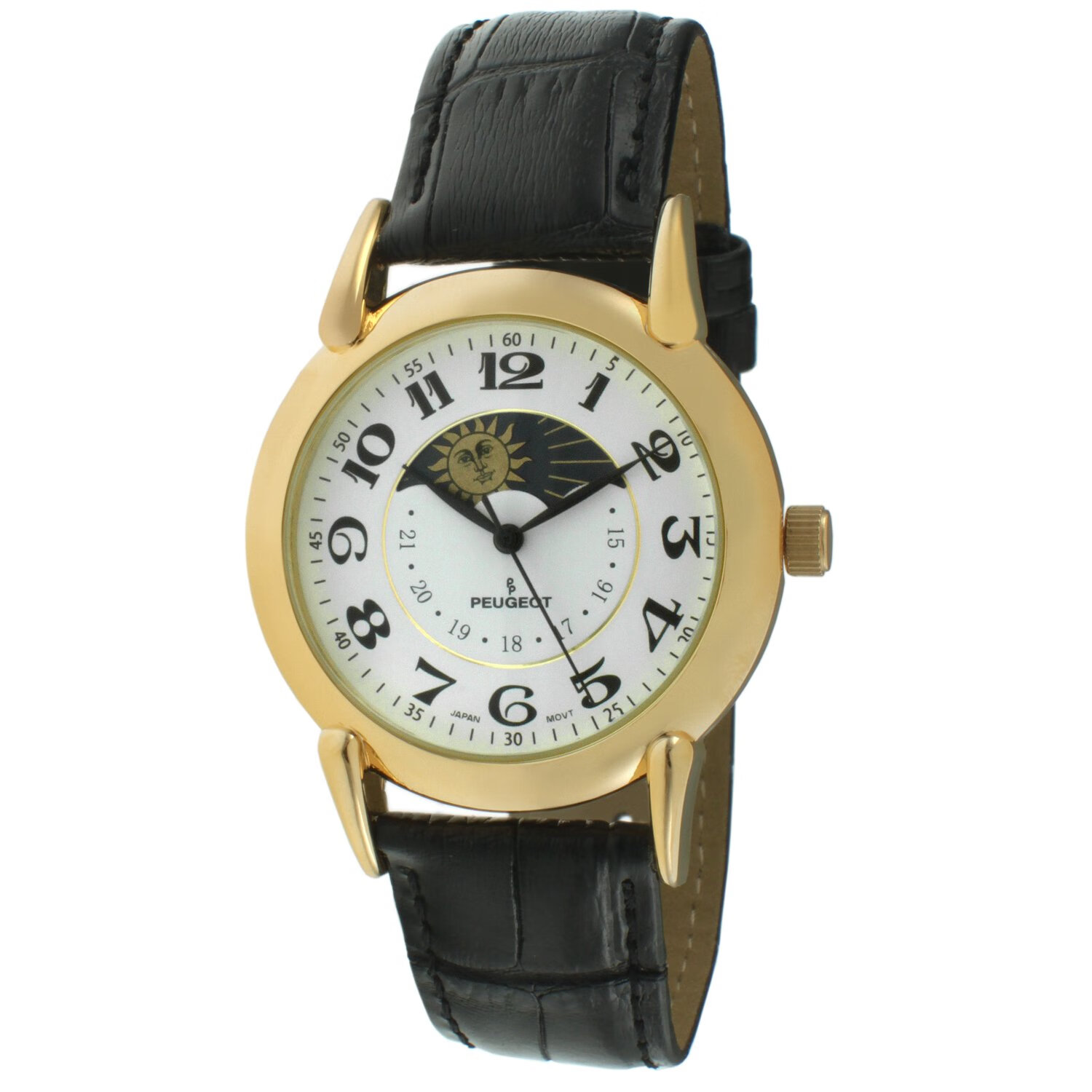 PEUGEOT 男士14K镀金复古腕表 日式石英机芯 月相窗显示 鳄鱼纹皮革表带 白色/黑色表带 38mm