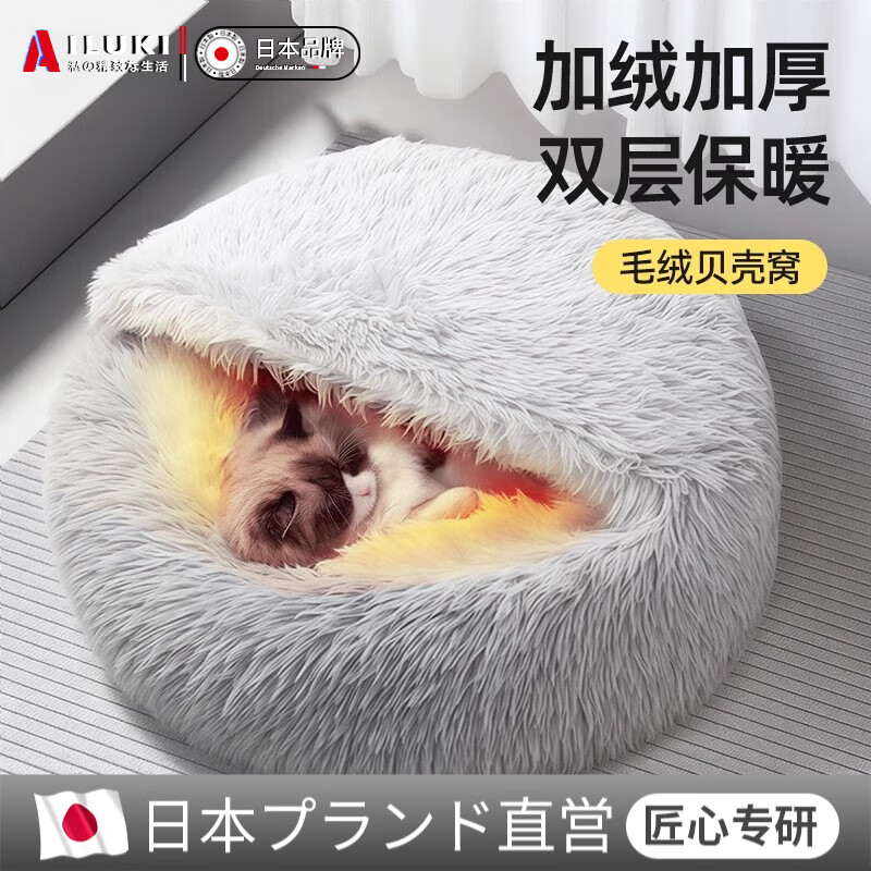 AILUKI日本高端猫窝冬季保暖宠物床四季通用狗窝深度睡眠冬天用品猫垫子 贝壳窝渐变灰色(短绒) 40cm