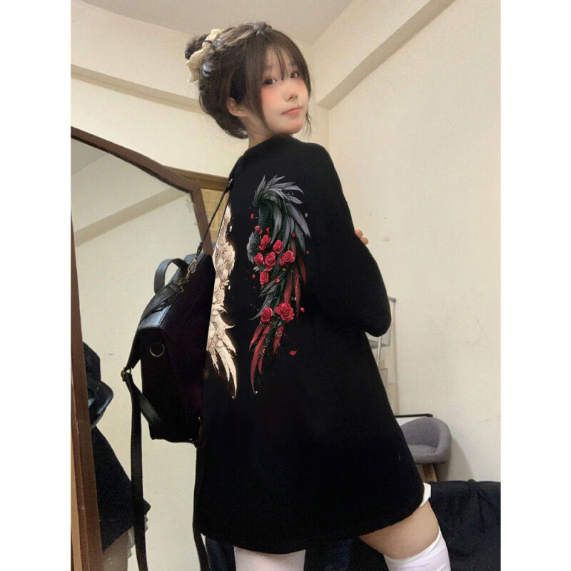 MODX美式高街潮牌翅膀印花恤女2026夏季新款宽松欧美情侣棉短袖男 黑色 S