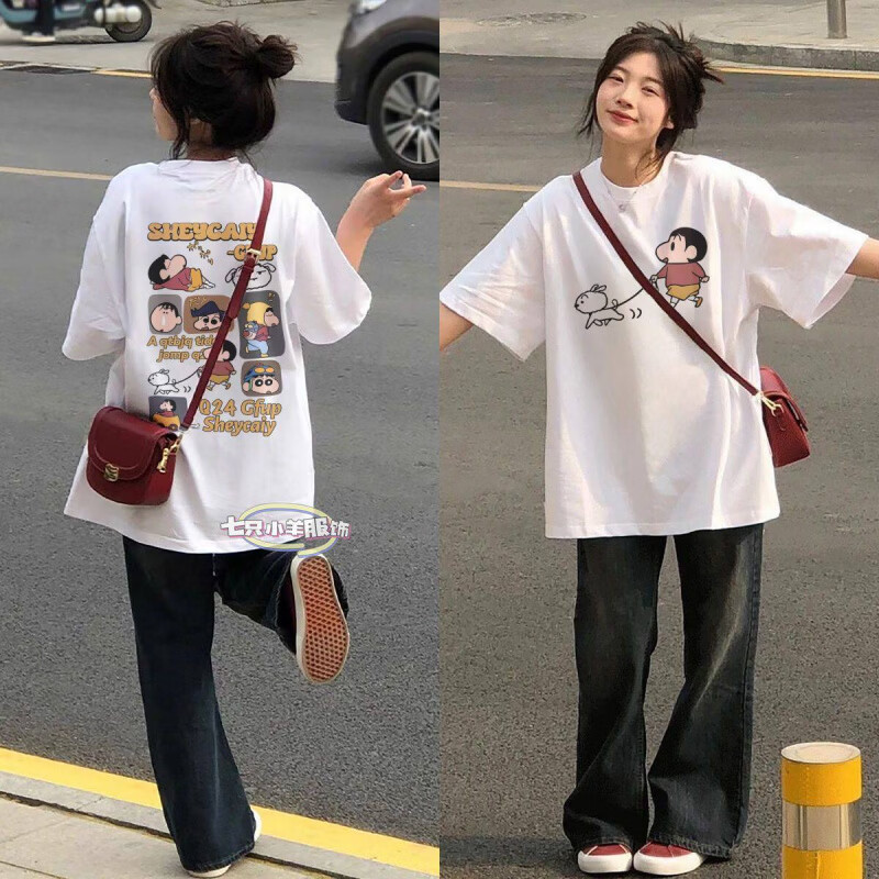 MODX夏季韩版潮牌情侣重磅棉恤短袖男女款宽松卡通小新印花上衣 小新牵狗 白色 S
