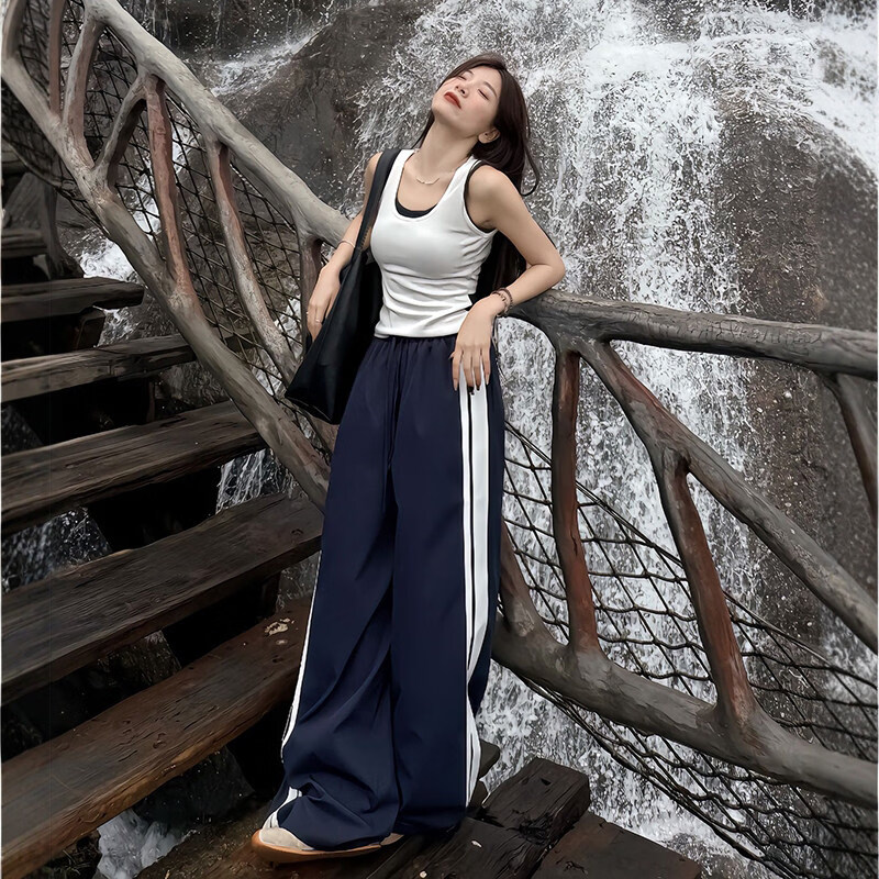 MODX双杠条纹弯刀西裤子男女款弹力垂感大码冰丝速干裤阔腿运动健身裤 黑色 M 【收藏加购优先发货】