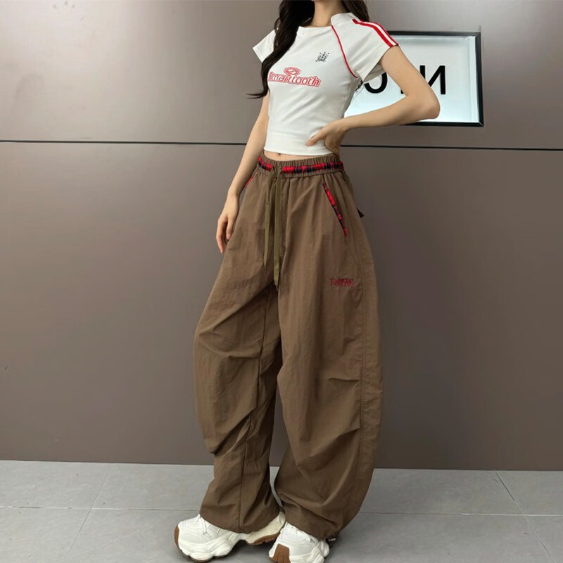 MODX宽松慵懒风伞兵裤男女款美式速干阔腿工装裤子撞色刺绣弯刀长裤 咖色 M
