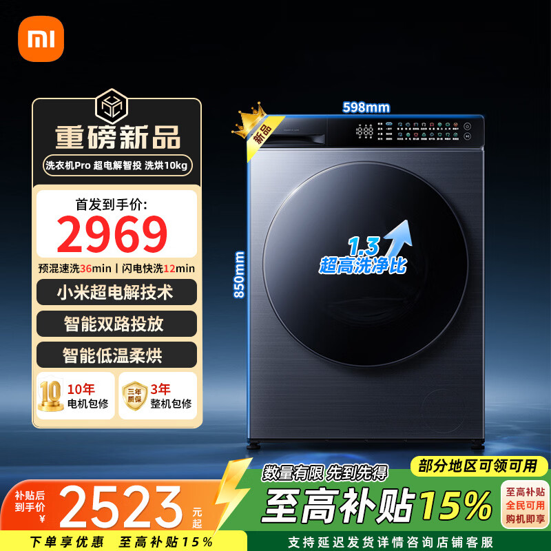 米家小米(MI)2026新款洗衣机Pro超电解智投洗烘10kg全自动智能双路投放1.3超高洗净比 XHQG100MJ206 洗烘一体 10kg