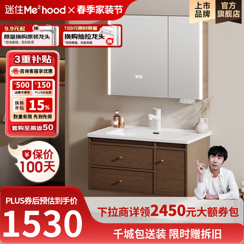 惠达(HUIDA)中古风智能浴室柜陶瓷一体盆双抽灯光除雾卫生间洗脸盆组合J60 90cm