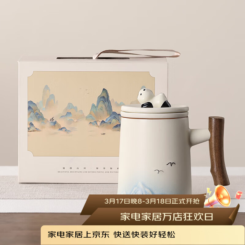 不拙茶水分离泡茶杯家用带盖喝水马克杯办公室高颜值大容量男女陶瓷杯 11【江山手提盒】熊猫渐变蓝水杯