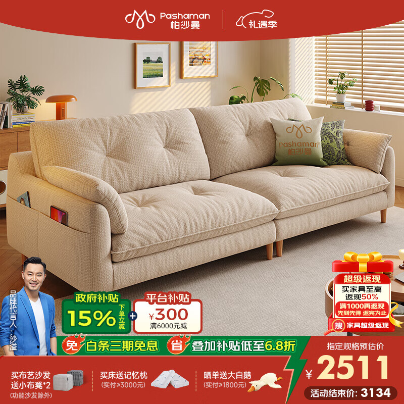 帕沙曼棉麻可拆洗布艺沙发小户型客厅原木风云朵小沙发双人直排 2950ZF 2.45米多人位【全拆洗设计】 防水棉麻JC988 【豪华版】轻弹棉+紫罗兰+竹炭海绵