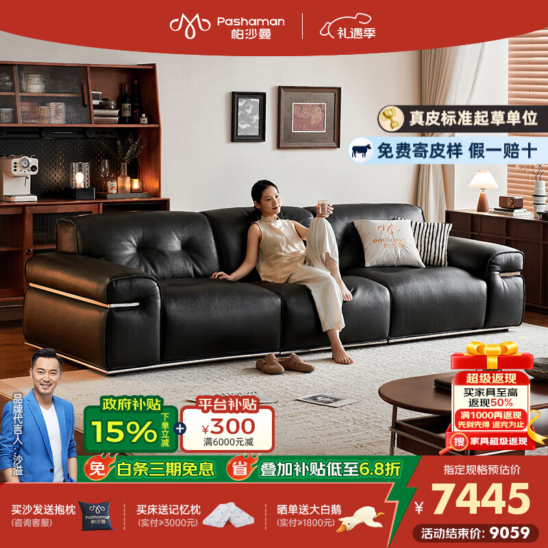 帕沙曼 真皮沙发大黑牛复古风意式极简客厅轻奢大座深小户型沙发7206ZP 3.17米多人位【全新零压坐感】 MU全真皮
