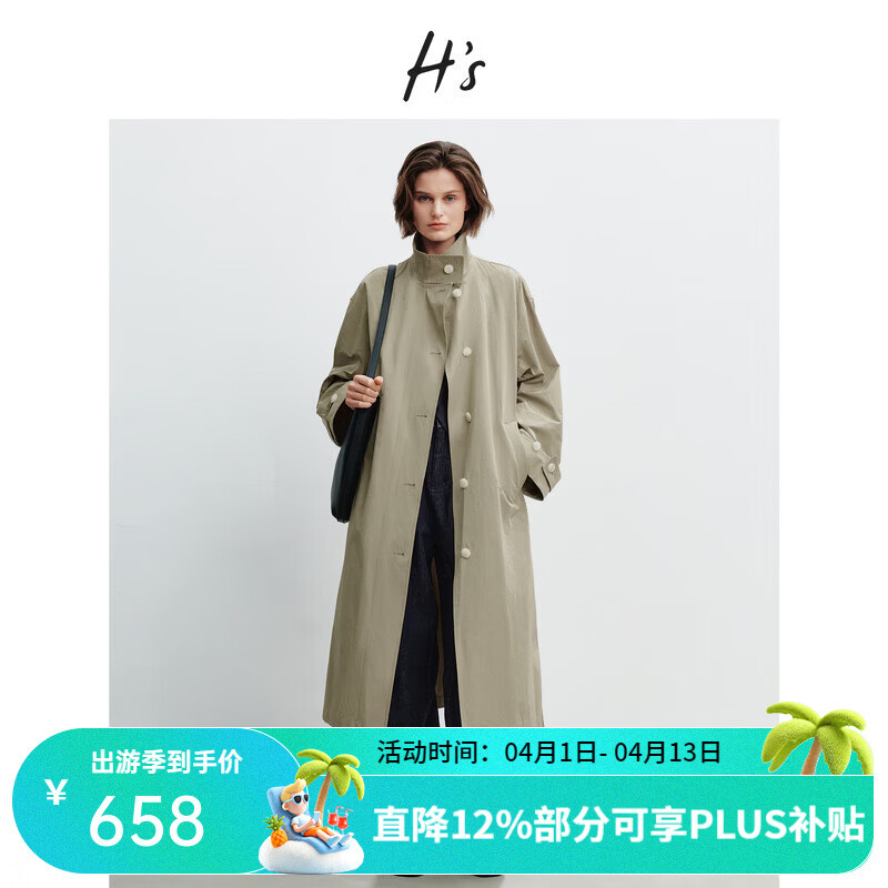 H's立领风衣外套女26春季新款高级设计感立体廓形静奢风巨好看外衣 绿卡其 S