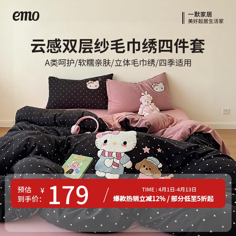 一默四件套被套床单床笠枕套云感双层纱小清新系列卡通毛巾绣四件套 kitty日记 2.0m 床单款 (被套200*230cm) 四件套