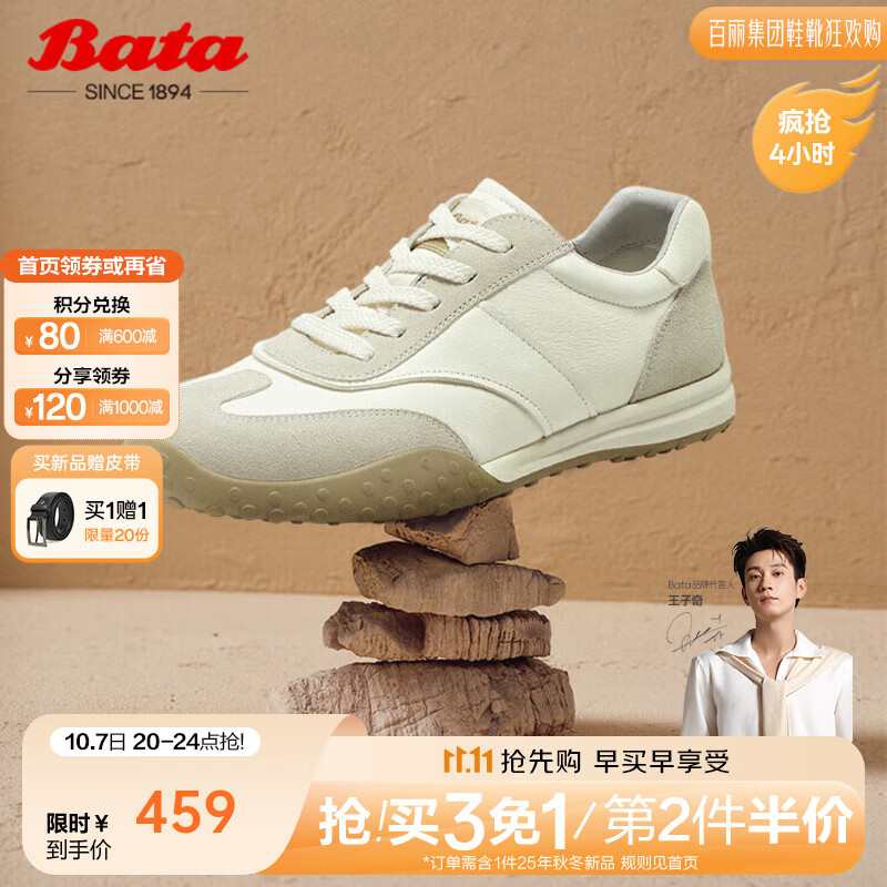 Bata王子奇同款休闲鞋男2025秋商场新款百搭羊皮德训运动鞋51069CM5 米色 40