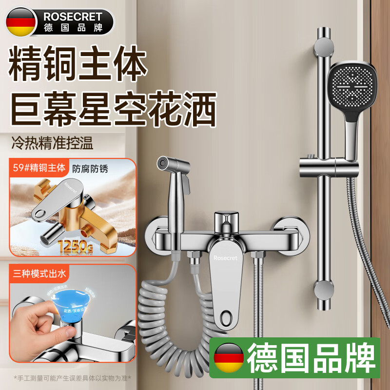 Rosecret【德国】淋浴花洒套装全铜主体家用浴室卫生间洗澡混水阀花洒全套 【三档花洒+喷枪淋浴花洒套装】亮银色 大流量出水丨自由升降杠丨配安装件包