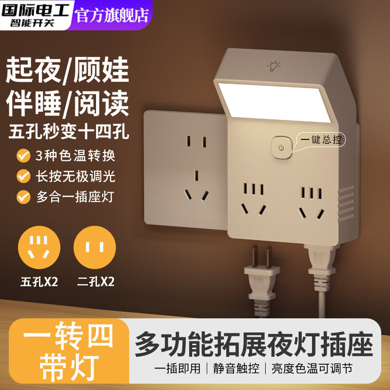 国际电工床头小夜灯卧室睡眠灯台灯带插座式照明灯一体多功能新款插电壁灯 白色一转四带灯