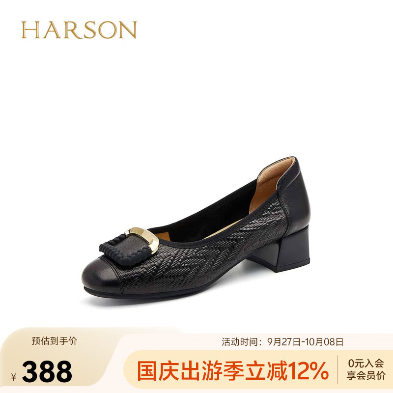 哈森时尚饰扣中粗跟百搭经典通勤上班浅口单鞋女2025秋HWL250117 黑色 羊皮革 35