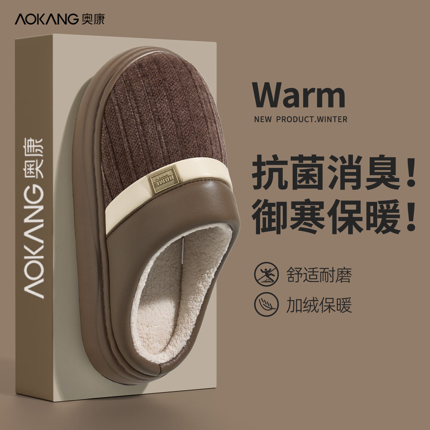 奥康(Aokang)抗菌消臭棉拖鞋男士秋冬季保暖居家用防滑防臭pu皮毛绒厚底拖鞋男 秋檀咖 42-43 【适合41-42】