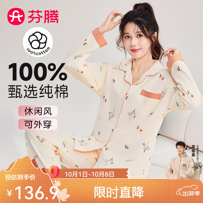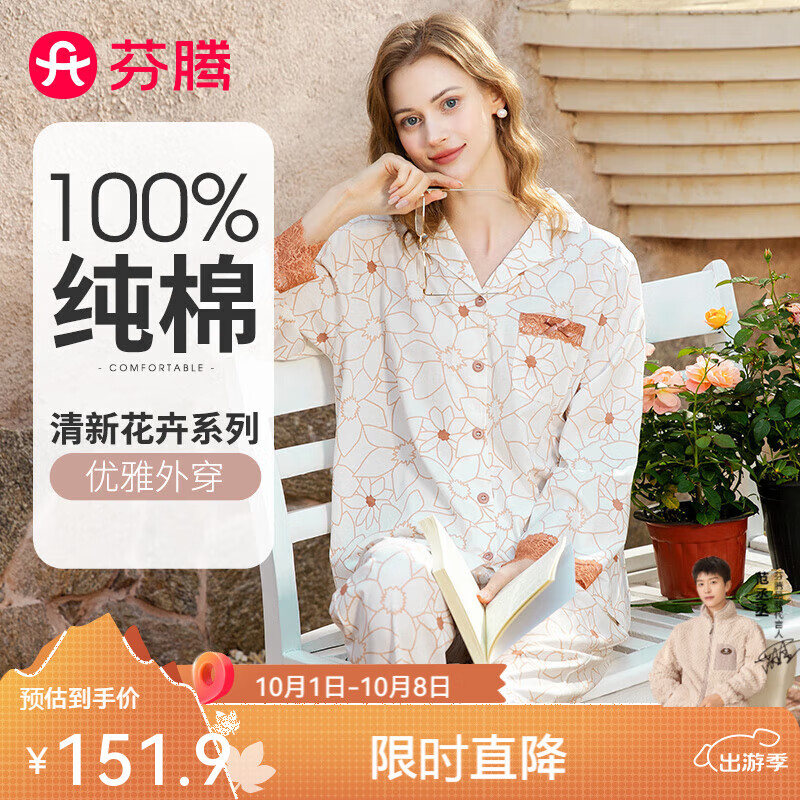 芬腾睡衣女士【花卉棉】翻领开衫长袖保暖家居服套装 杏色 L