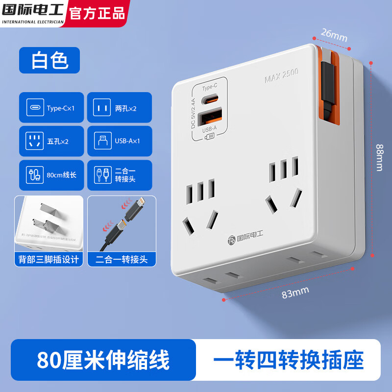 国际电工一转多无线充电转换插座带伸缩线多功能拓展转换插头usb扩展电源 白色14孔【20W快充A+C】80cm线长