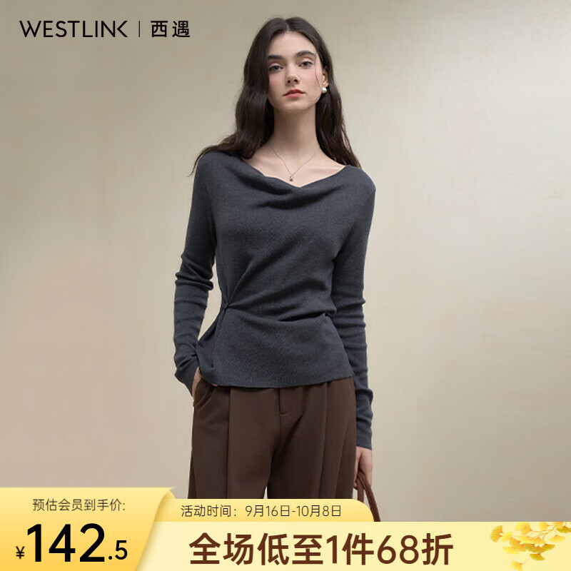 西遇法式荡领气质长袖针织T恤女2025秋季抽褶收腰显瘦内搭打底衫 黑色 (预售9月2日) L (165)