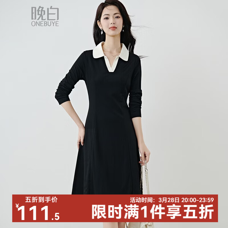 晚白【新品】2026春款黑白撞色V型翻领棉感裙子小个子显高休闲连衣裙 黑色 L