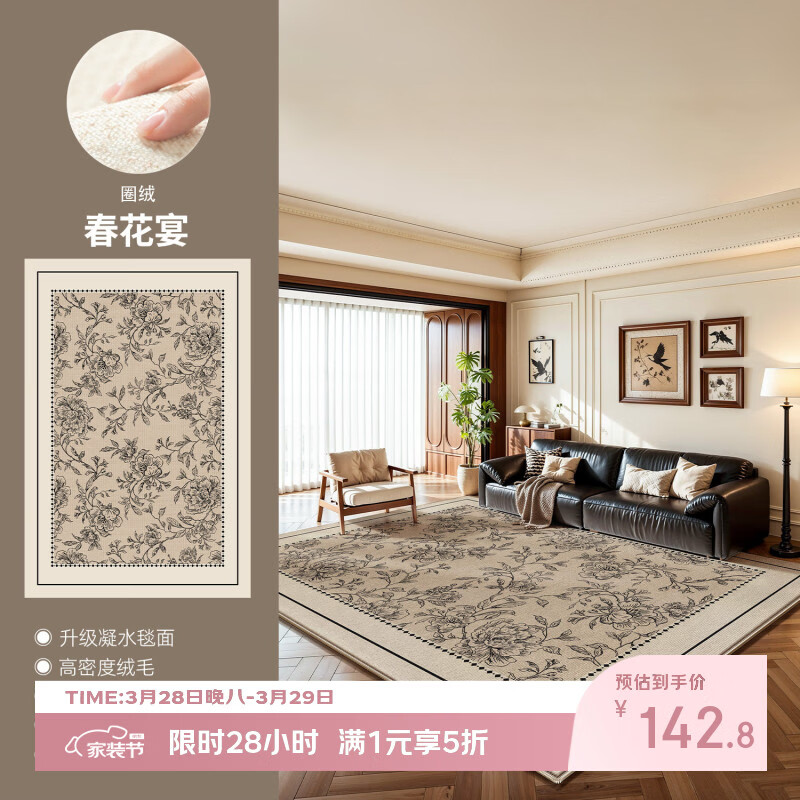 著忆中古风地毯客厅2026新款法式复古免洗可擦防水防污卧室茶几地垫 圈绒-春花宴-透气防滑款 140×200CM【当季新款】