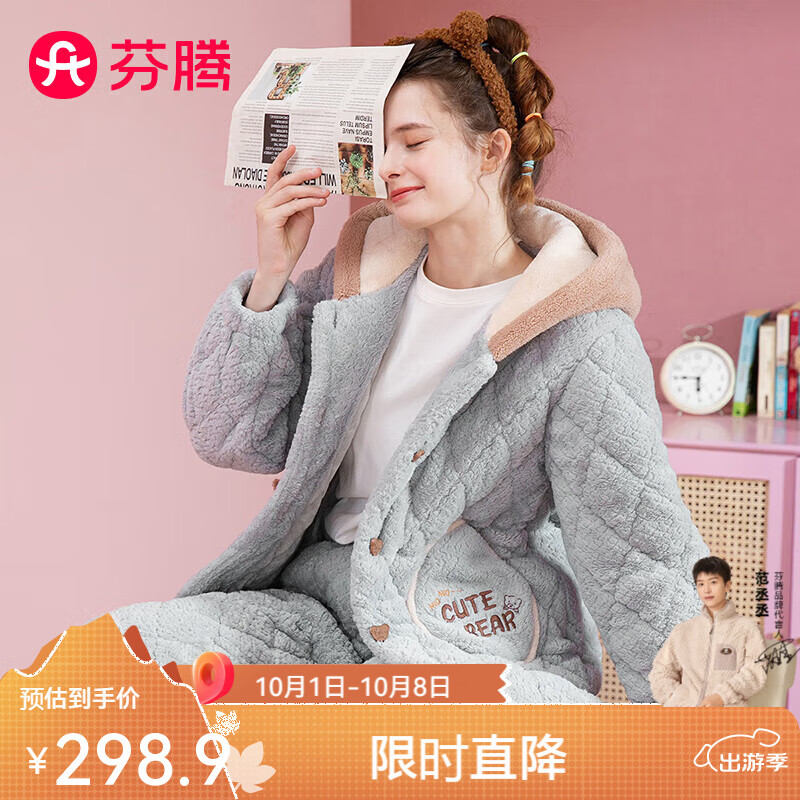 芬腾睡衣女冬季长袖新款三层夹棉加厚珊瑚绒卡通小熊家居服套装 梦幻灰兰 S