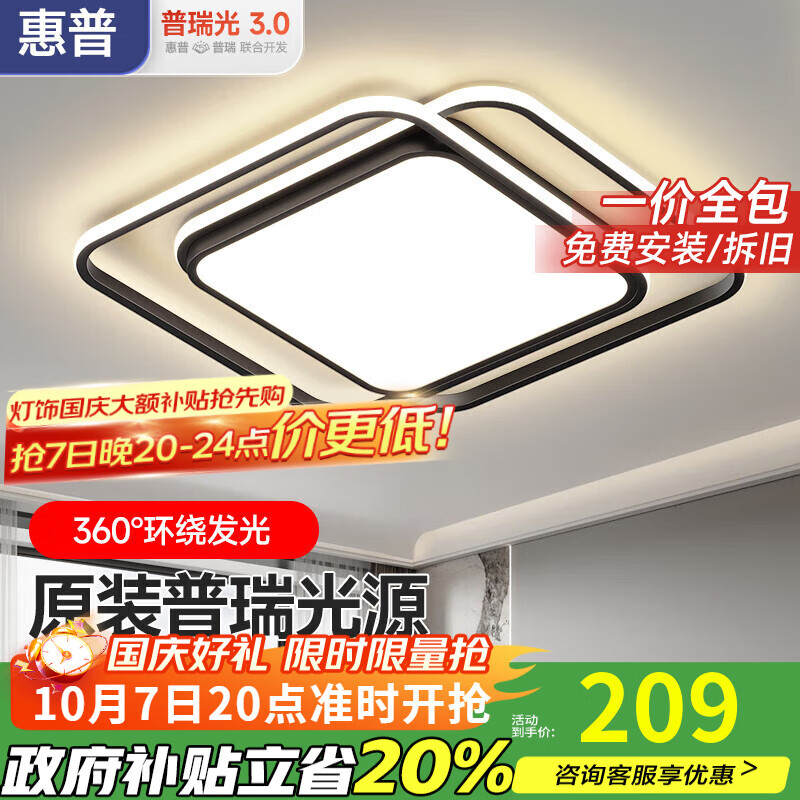 惠普客厅灯现代简约大气吸顶灯新款护眼led超亮主灯全屋灯具组合套餐 50cm方形-三色变光