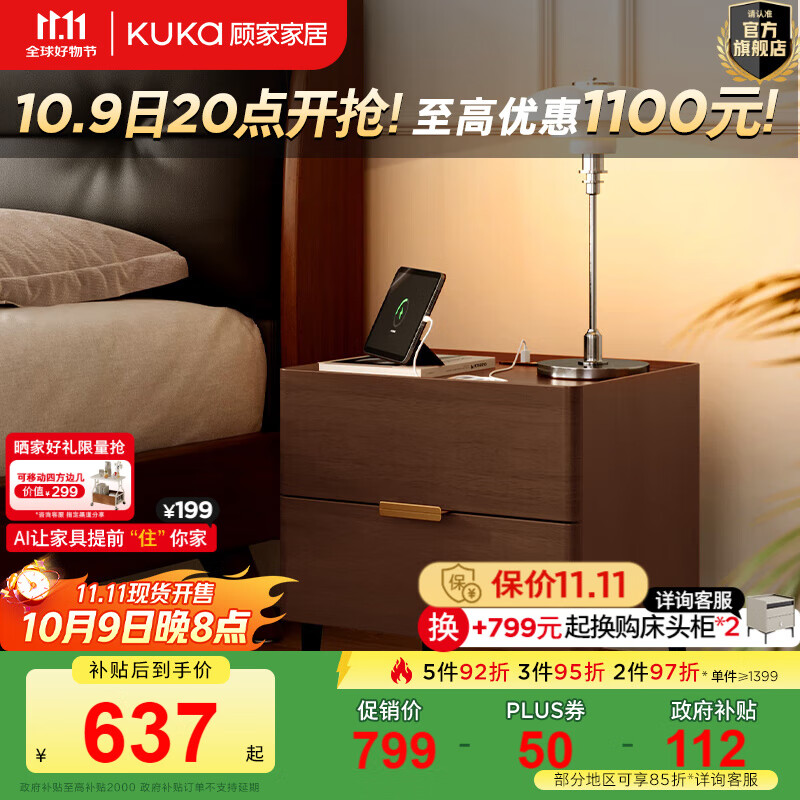 顾家家居意式床头柜卧室家用床边高脚柜简约带灯床头柜收纳储物柜8016 【奢华全实木胡桃色】经典款
