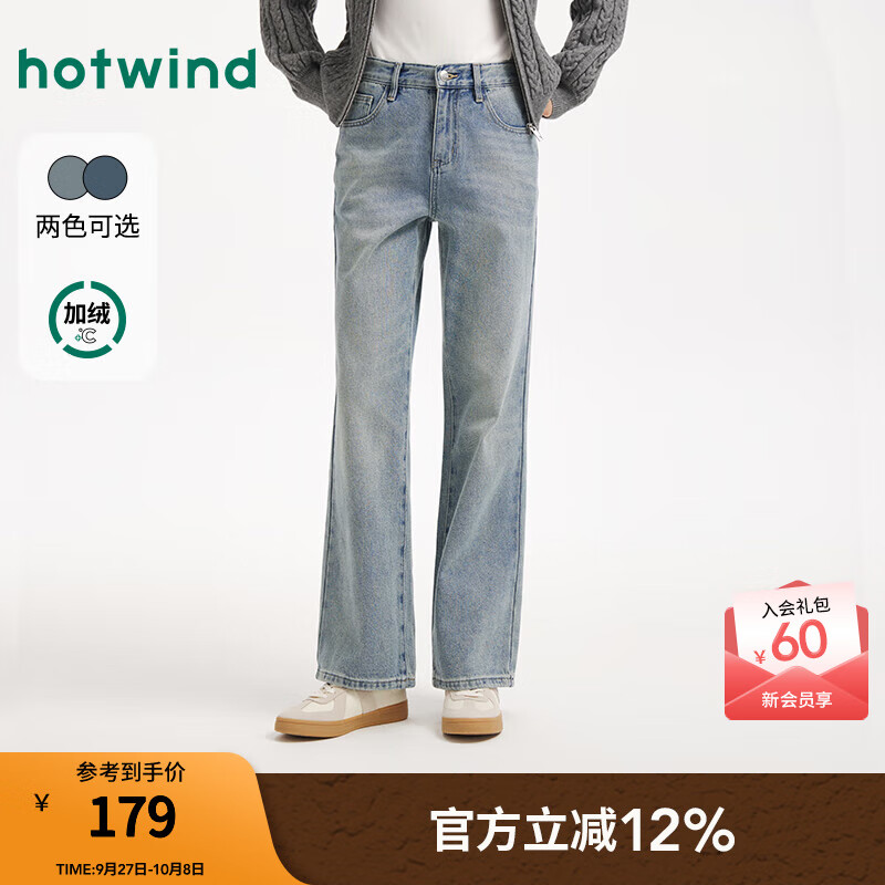 热风(Hotwind)女士加绒牛仔裤宽松直筒2025年冬季新款显瘦直筒阔腿保暖长裤 28浅兰 28