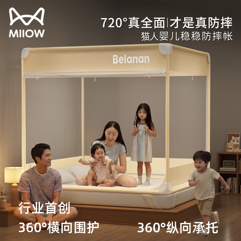 猫人(MiiOW)A类母婴儿防摔蚊帐1.8x2米家用一体式免安装床围栏加粗加厚带支架 max-米色【加固防护宝宝安全】加粗35%支架 【适用1.8x2.0m床】真防摔免拼接支架