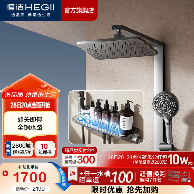 恒洁(HEGII)花洒淋浴套装 全铜琴键方管贴墙家用增压喷头淋浴花洒套装 【即关即停】全铜水路A53