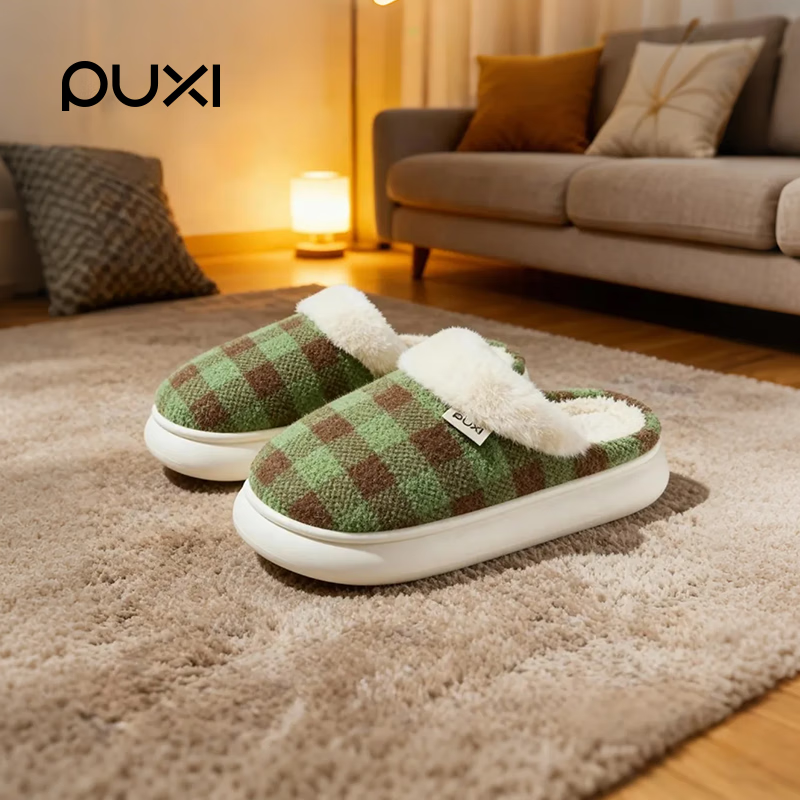 朴西2025冬季新款格子保暖防滑棉拖鞋室内厚底耐磨毛绒棉拖女 孔雀绿 37-38 【正常码】