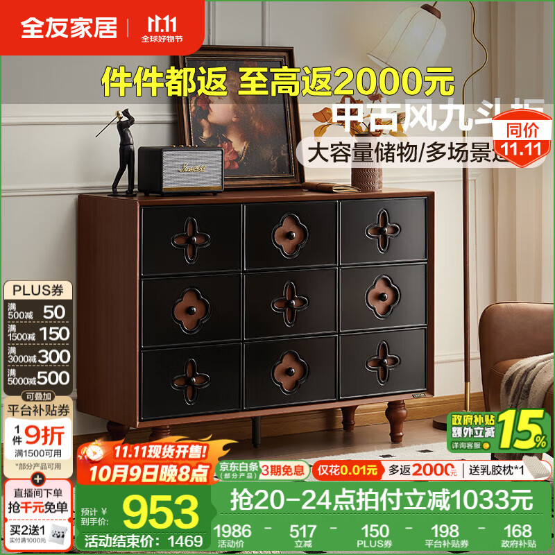 全友家居中古风九斗柜餐边柜收纳柜床尾柜置物收纳小柜子玄关柜杂物柜 【中古风】九斗柜