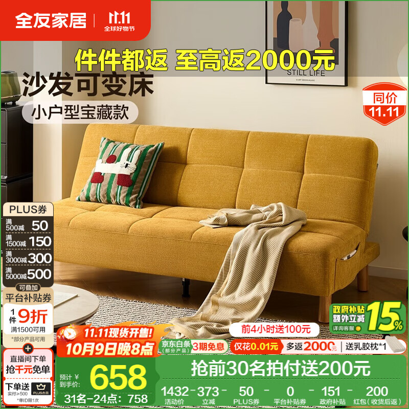 全友家居奶油风布艺沙发家用小户型沙发床折叠床三防雪尼尔布艺家具 【鹅黄色 | A类雪尼尔】1.8m沙发床 5档可调+可变床+实木腿+54cm座深