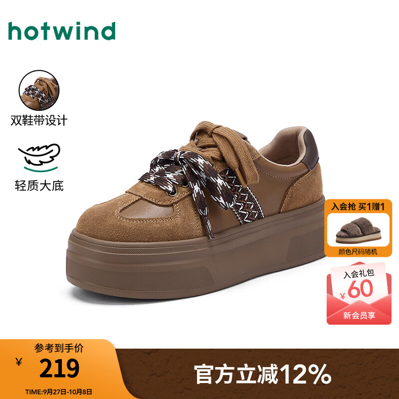 热风女鞋松糕厚底板鞋2025年冬季新款女士复古时尚双鞋带休闲德训鞋 02棕色 37