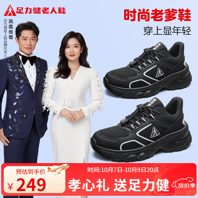 足力健中老年男女秋季复古时尚老爹鞋软弹厚底舒适轻便休闲鞋 黑色-男款 42