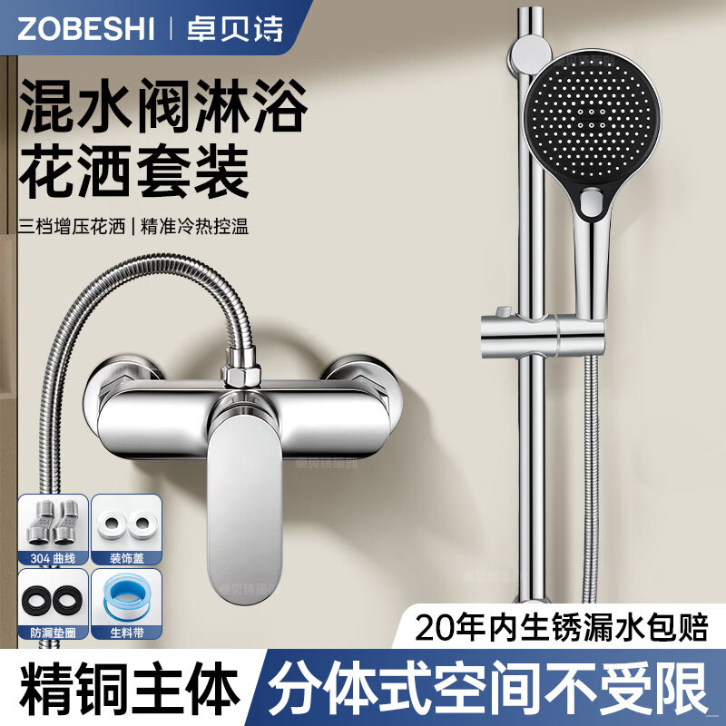 卓贝诗 淋浴混水阀水龙头无顶喷简易花洒套装浴室冷热水龙头花洒二合一 银色升降杆款-花洒三件套