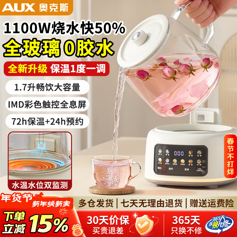奥克斯(AUX)养生壶全玻璃烧水壶保温一体全自动恒温壶煮茶炖煮一体多功能热水壶家用大容量办公室花茶壶0胶水 1.7L /基础款