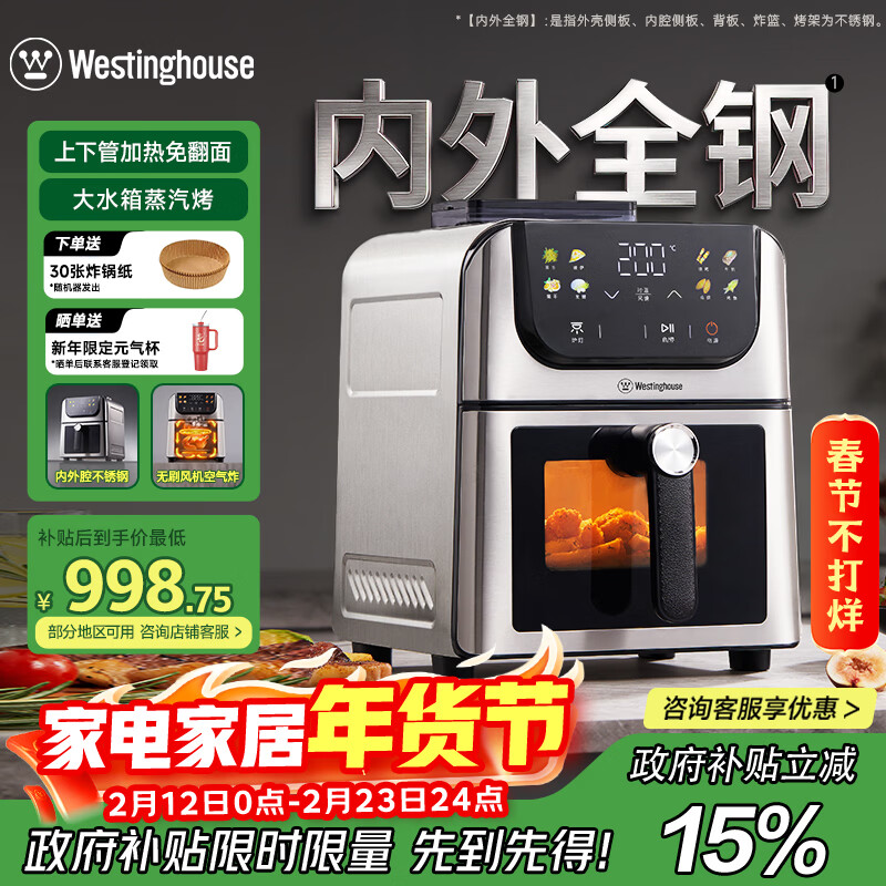 西屋空气炸锅不锈钢金属可视双热源免翻面6L大容量烤箱电炸锅 WKZ60H10 Ultra 6L