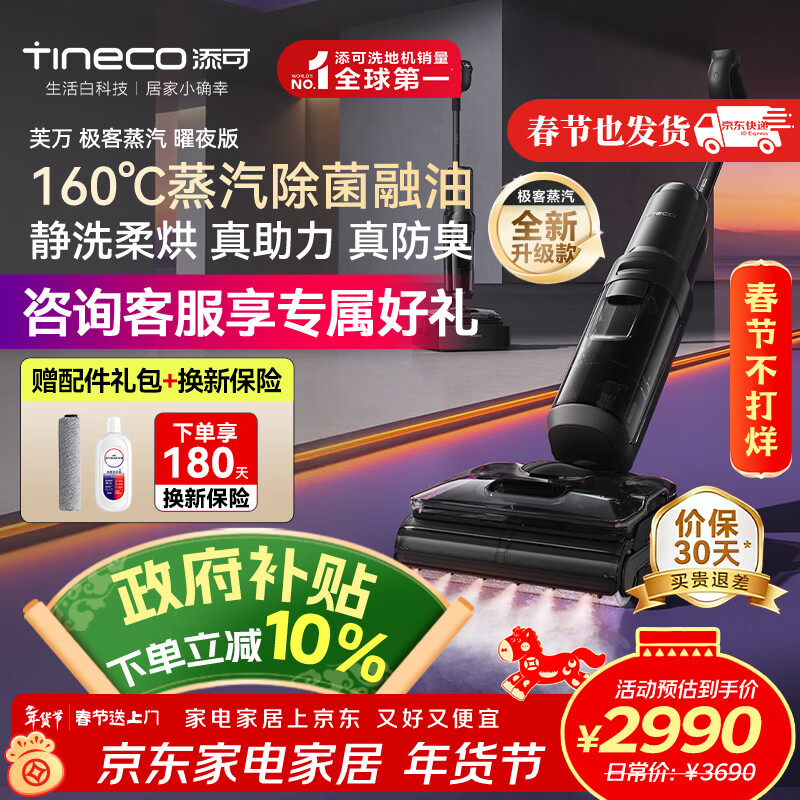 添可(TINECO)极客曜夜 蒸汽版 AI全向助力【160℃蒸汽除油污 90min续航】0缠毛躺平洗地机吸拖一体扫地机器人 【咨询再减】极客曜夜蒸汽版